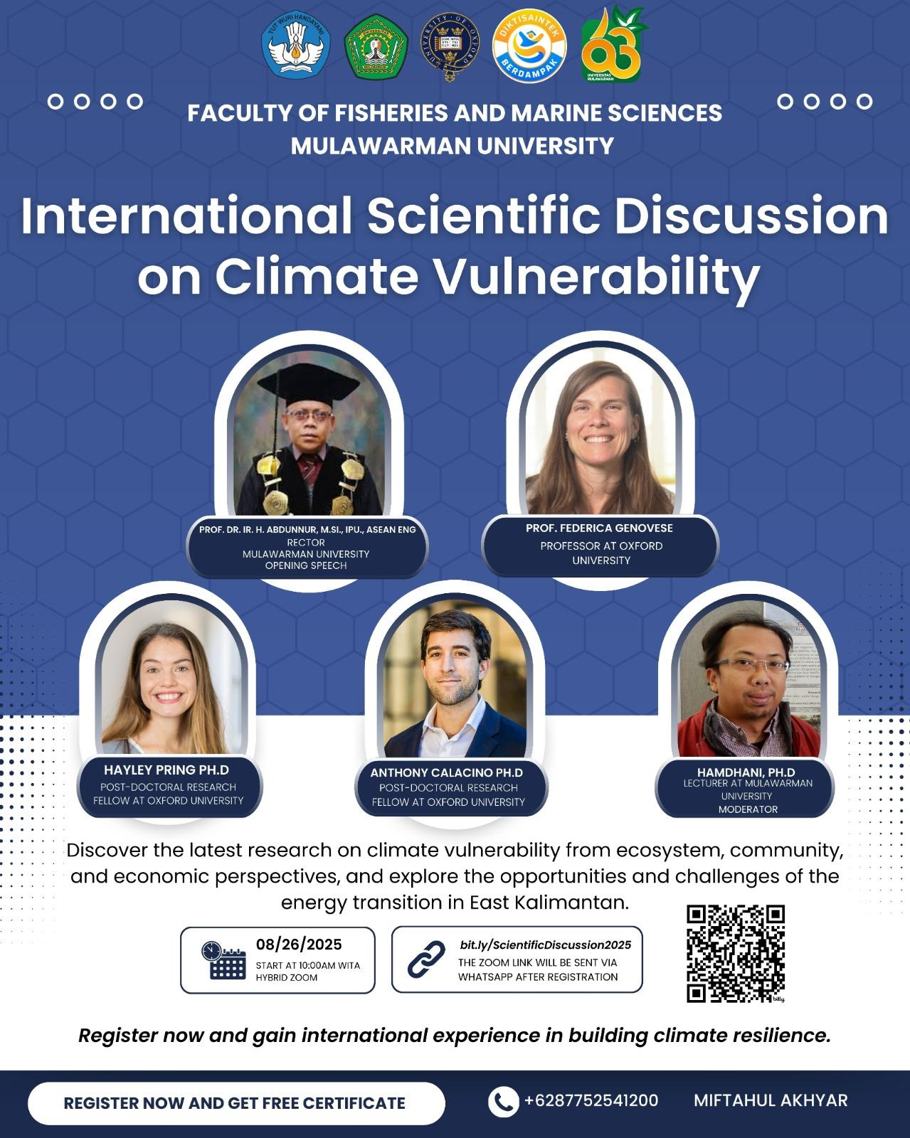 Kegiatan ini akan menghadirkan para pakar dari Oxford University yang akan membagikan riset dan wawasan mereka terkait kerentanan iklim di berbagai sektor penting—termasuk ekosistem laut dan pesisir, komunitas lokal, serta dampaknya terhadap pembangunan ekonomi.