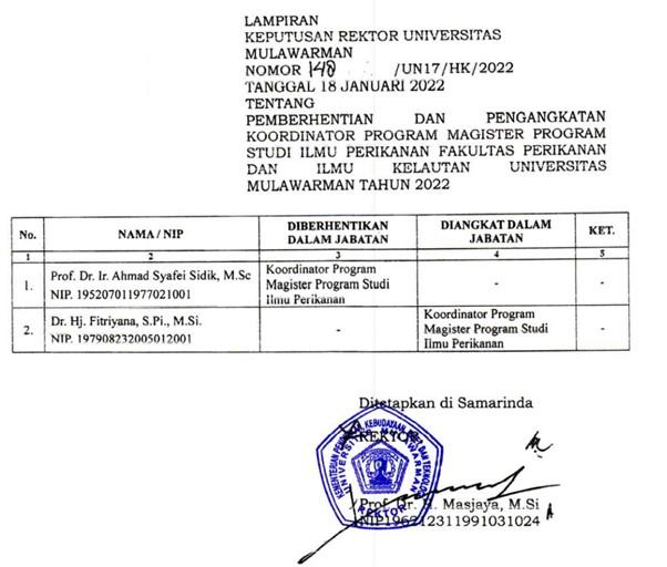 Tugas dan amanah sebagai koordinator program studi magister ilmu perikanan dijalankan dimulai pada tanggal 3 Januari 2022 sampai dengan tanggal 30 April 2025 berdasarkan SK Rektor Universitas Mulawarman No.148/UN17/HK/2022 pada tanggal 18 Januari 2022 yang diusulkan oleh Dekan Fakultas Perikanan dan Ilmu Kelautan Universitas Mulawarman berdasarkan surat nomor. 51/UN17.6/KP/2022 tertanggal 5 Januari 2022.