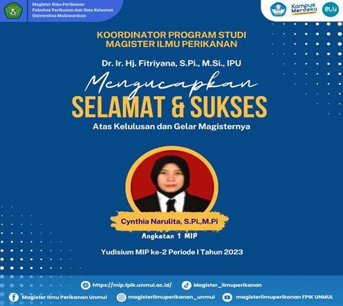 Cynthia Narulita, S.Pi., M.Pi., sebagai mahasiswa Magister Ilmu Perikanan Angkatan pertama yang berhasil meraih gelar M.Pi Magister Perikanan pada 28 Juni 2021 dan mengikuti sesi Yudisium Ke-2 MIP Periode Gelombang I Tahun 2023 bertempat diruang Kerapu pada hari Kamis, 16 Maret 2023. Dalam skripsi berjudul “Analisis Kelayakan Finansial dan Strategi Pembangunan Usaha Keramba Jaring Apung (KJA) Ikan Mas (Cyprinus Carpio) di Desa Pulau Harapan Kecamatan Muara Muntai.”, Cynthia berhasil menganalisis apakah usaha budidaya ikan mas dalam keramba jaring apung (KJA) di Desa Pulau Harapan, Kecamatan Muara Muntai, layak secara finansial dan mengidentifikasi strategi yang tepat untuk mengembangkan usaha tersebut. Hasil penelitian ini dapat digunakan sebagai dasar untuk menyusun rekomendasi kebijakan bagi pemerintah daerah, baik terkait dengan pengembangan usaha KJA maupun peningkatan kesejahteraan masyarakat perikanan.