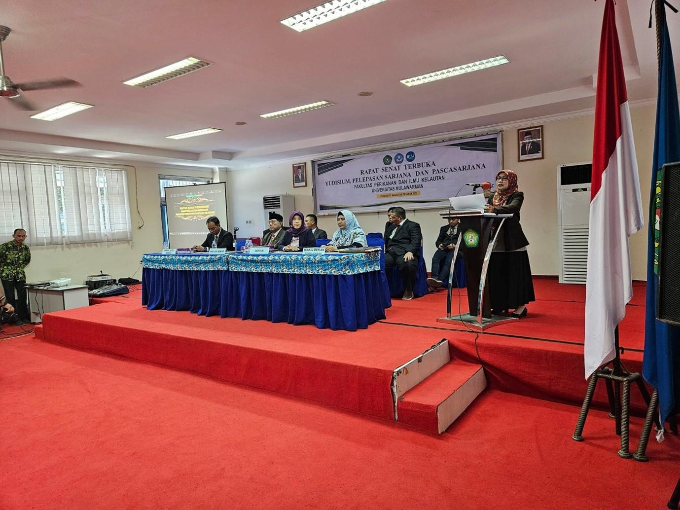 Dalam sambutannya, Koordinator Program Studi Magister Ilmu Perikanan, Dr. Ir. Hj. Fitriyana, S.Pi., M.Si., IPU, menekankan kebanggaan atas keberhasilan para mahasiswa yang telah menyelesaikan pendidikan mereka dengan penuh dedikasi. Beliau mengapresiasi kerja keras dan komitmen para lulusan dalam menyelesaikan studi, yang menjadi bukti nyata dari semangat belajar dan ketekunan mereka. Beliau juga menyampaikan harapan agar ilmu dan gelar yang diraih tidak hanya menjadi pencapaian akademik, tetapi juga dapat memberikan manfaat besar bagi masyarakat, khususnya dalam bidang perikanan dan kelautan. Para lulusan diharapkan mampu menjadi agen perubahan dan inovasi, berkontribusi dalam pengembangan sektor perikanan yang berkelanjutan, serta membawa nama baik Universitas Mulawarman di tingkat nasional maupun internasional. Dengan semangat optimisme, Kaprodi mengajak para lulusan untuk terus belajar, berkarya, dan menjaga integritas sebagai lulusan perguruan tinggi yang unggul. Sambutan diakhiri dengan ucapan selamat dan doa untuk kesuksesan masa depan para lulusan.