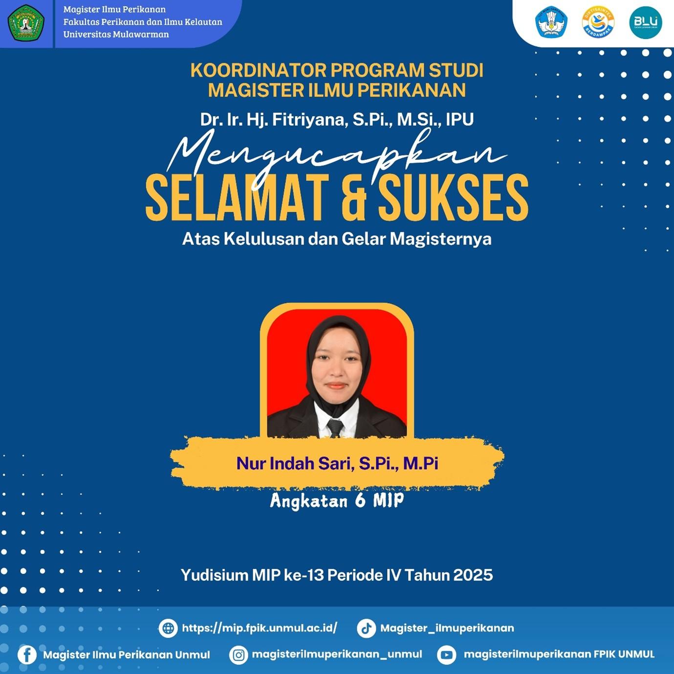 Nur Indah Sari, S.Pi., M.Pi (Tanggal Lulus: 11 Juni 2025) dengan judul Tesis “Kajian Model Bisnis Ekowisata Bahari Pulau Beras Basah Pada Kawasan Konservasi Perairan Kota Bontang” predikat kelulusan Sangat Memuaskan dengan IPK 3.97
